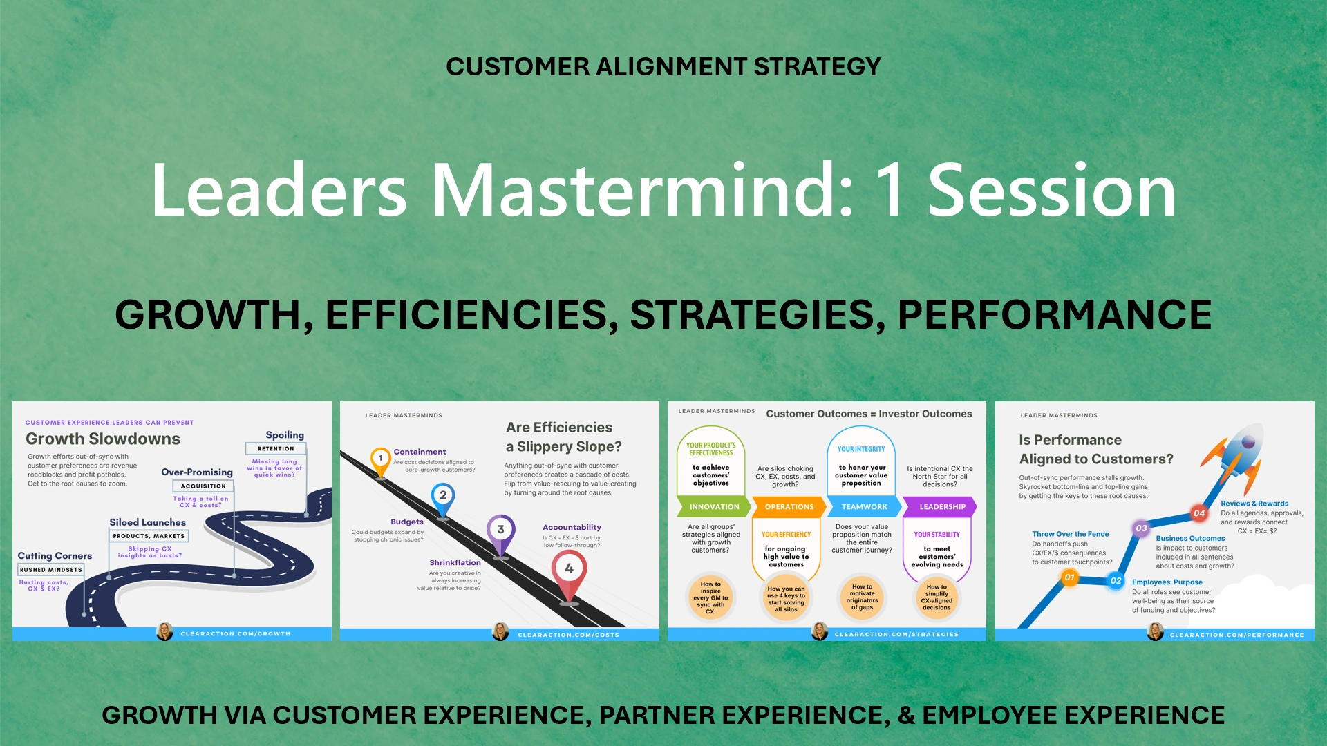 Attend any 90-minute interactive Mastermind session for Customer-Aligned Growth, Performance, Strategies, or Efficiencies.